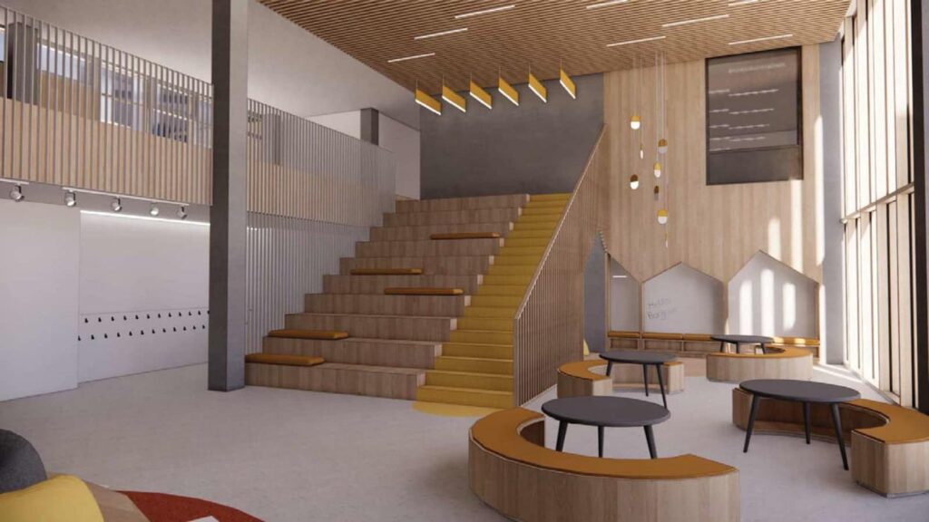 La salle polyvalente est un local qui est considéré comme le lieu identitaire de l’école et du service de garde. L’espace polyvalent est convivial et s’intègre harmonieusement au reste de l’école et à la cour.